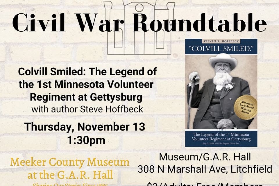 The G.A.R. Hall and Meeker County Museum will be hosting the monthly Civil War Roundtable discussion next Thursday. The meetings are held on the second Thursday of each month at 1:30.
